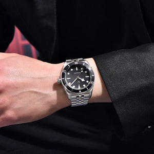 La montre Pagani Design Cruise Black est étanche jusqu'à 100 mètres, vous offrant confiance et tranquillité d'esprit lors de vos activités nautiques. La couronne de la Pagani Design Cruise Black est vissée pour une étanchéité parfaite. Consultez le manuel d'utilisation et de garantie pour plus d'informations.