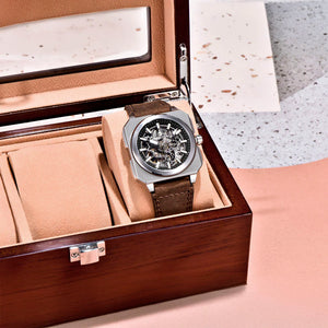 La montre Pagani Design Factory Black Brown utilise du verre saphir, l'un des matériaux les plus prestigieux du monde de la haute horlogerie, connu pour sa transparence et sa durabilité exceptionnelles.