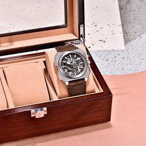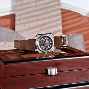 La montre Pagani Design Factory Brown utilise du verre saphir, l'un des matériaux les plus prestigieux du monde de la haute horlogerie, connu pour sa transparence et sa durabilité exceptionnelles.