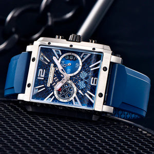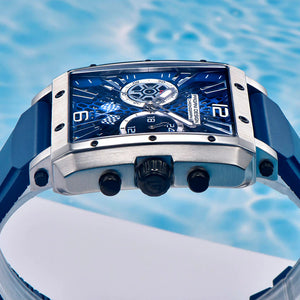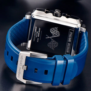 La Pagani Design Monaco Silver Blue est étanche jusqu'à 100 mètres, vous procurant confiance et tranquillité d'esprit lors de vos activités nautiques. La couronne de la Pagani Design Monaco Silver Blue est vissée pour garantir une étanchéité parfaite. Consultez le manuel d'utilisation et de garantie pour plus d'informations.
