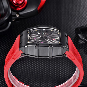 La montre Pagani Design Monza Black Red utilise du verre saphir, l'un des matériaux les plus prestigieux du monde de la haute horlogerie, connu pour sa transparence et sa durabilité exceptionnelles.