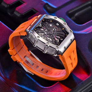 La montre Pagani Design Monza Silver Orange utilise du verre saphir, l'un des matériaux les plus prestigieux du monde de la haute horlogerie, connu pour sa transparence et sa durabilité exceptionnelles.