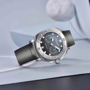 La montre Pagani Design Number 1 Grey est étanche jusqu'à 200 mètres, vous offrant confiance et tranquillité d'esprit lors de vos activités nautiques. La couronne de la Pagani Design Number 1 Grey est vissée pour garantir une étanchéité parfaite. Consultez le manuel d'utilisation et de garantie pour plus d'informations.
