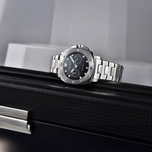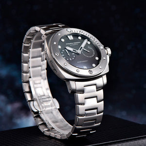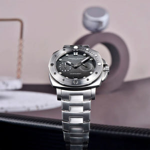 La montre Pagani Design Number 1 Grey est étanche jusqu'à 200 mètres, vous offrant confiance et tranquillité d'esprit lors de vos activités nautiques. La couronne de la Pagani Design Number 1 Grey est vissée pour garantir une étanchéité parfaite. Consultez le manuel d'utilisation et de garantie pour plus d'informations.