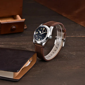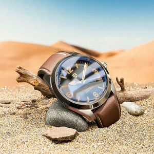 La montre Pagani Design Ranger Black Classic Edition est étanche jusqu'à 200 mètres, vous offrant confiance et tranquillité d'esprit lors de vos activités aquatiques. La couronne de la Pagani Design Ranger Black Classic Edition est vissée pour une étanchéité parfaite. Consultez le manuel d'utilisation et de garantie pour plus d'informations.