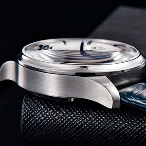 La montre Pagani Design Roma Silver White utilise du verre saphir synthétique, l'un des matériaux les plus prestigieux du monde de la haute horlogerie, connu pour sa transparence et sa durabilité exceptionnelles.