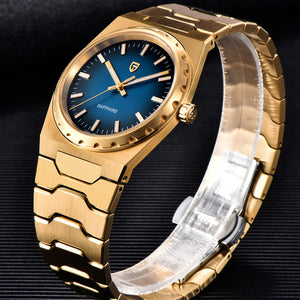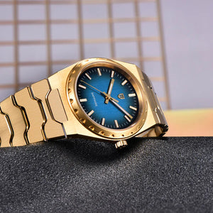 Le mouvement Seiko TMI VJ21 est un mouvement à quartz de haute précision reconnu pour sa précision et sa fiabilité exceptionnelles. La Pagani Design Drift Gold Blue, équipée du mouvement TMI VJ21, offre une précision et une fiabilité exceptionnelles.
