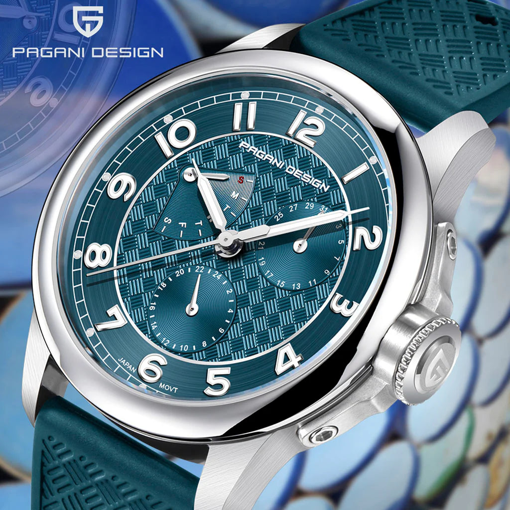 Achetez votre Pagani Design Flow Blue sur notre site web et recevez son emballage. Cette montre est le choix idéal pour ceux qui recherchent qualité et raffinement. Investissez dans la Pagani Design Flow Blue et découvrez l'excellence jusque dans les moindres détails.