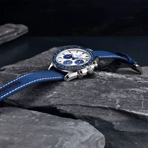 Le bracelet Pagani Design Lorenzo Blue Classic Edition est soigneusement confectionné à partir de matériaux haut de gamme, alliant la résistance du nylon à la légèreté du caoutchouc. Il offre un confort inégalé et la sensation unique d'une montre presque imperceptible au poignet.