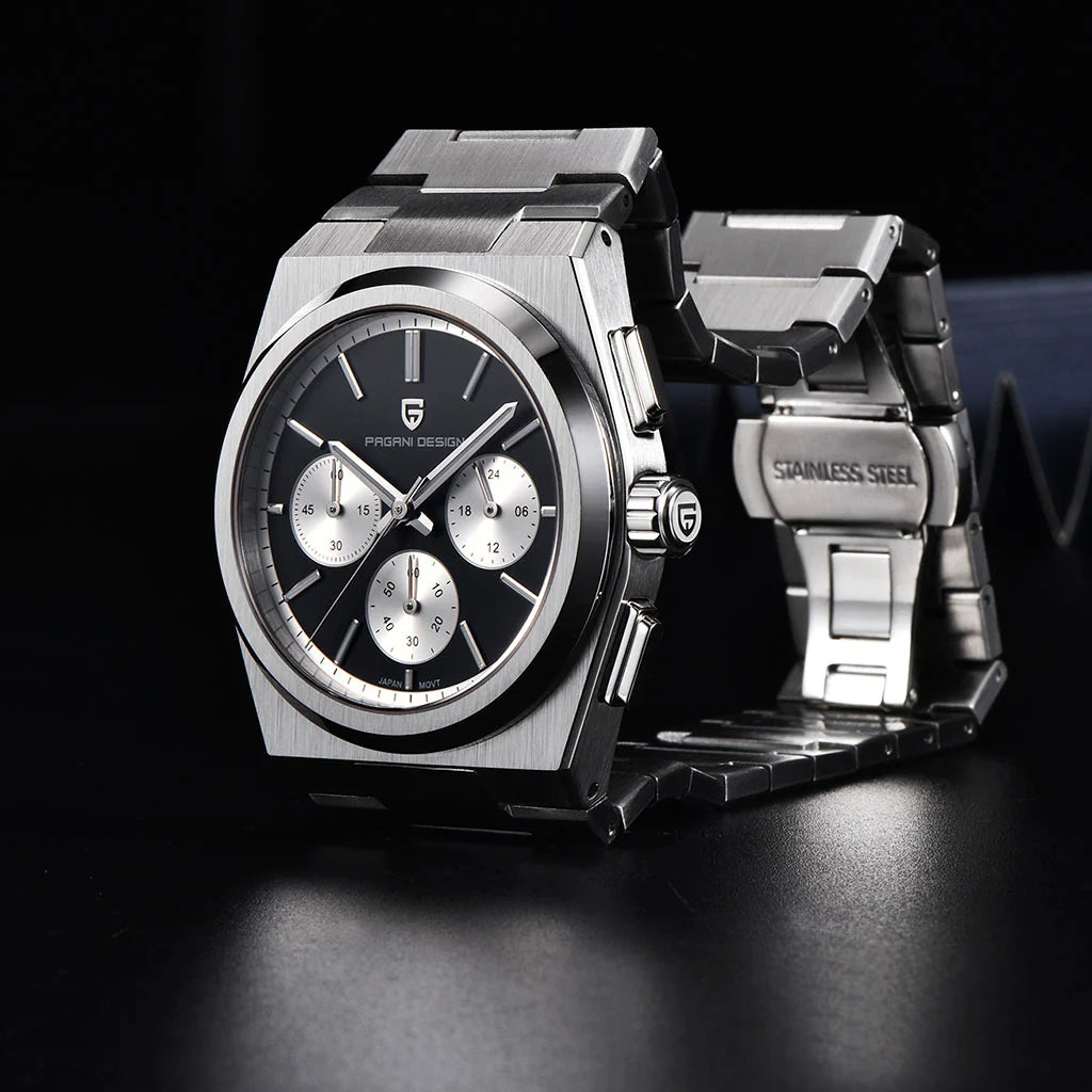 Le mouvement Seiko VK63 est reconnu pour ses performances exceptionnelles en termes de précision et de fiabilité. La Pagani Design Tide Black, équipée du mouvement VK63, offre un chronographe fluide et précis.
