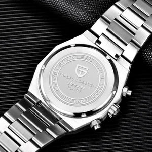 La montre est étanche jusqu'à 100 mètres, vous offrant confiance et tranquillité d'esprit lors de vos activités aquatiques. La couronne de la Pagani Design Track Black est vissée pour garantir une étanchéité parfaite. Consultez le manuel d'utilisation et de garantie pour plus d'informations.