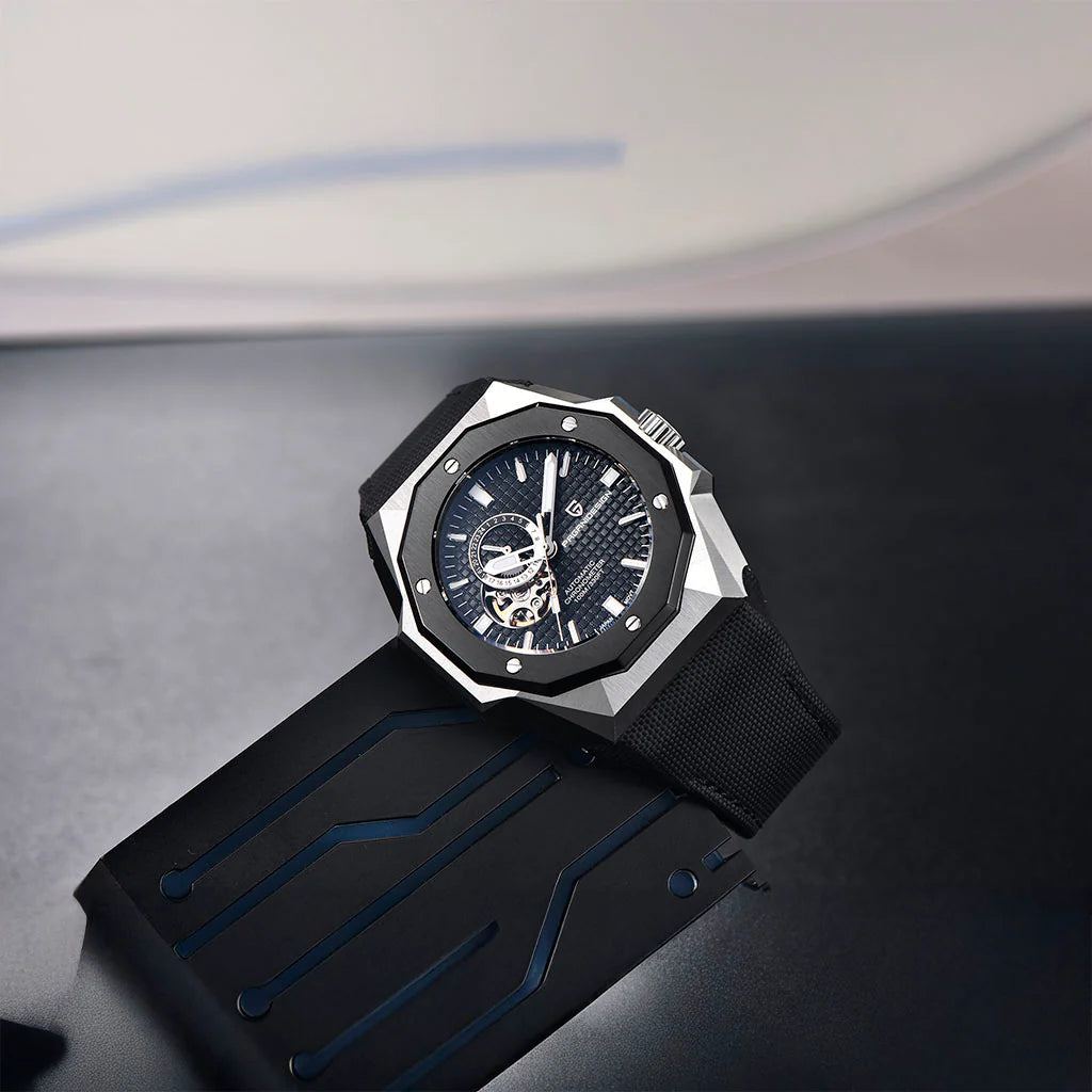 Le mouvement Seiko NH39 est une version améliorée du Seiko NH39, réputée pour sa précision et sa fiabilité exceptionnelles. La Pagani Design Armored Black, équipée du mouvement NH39, bénéficie d'une impressionnante réserve de marche d'environ 45 heures.