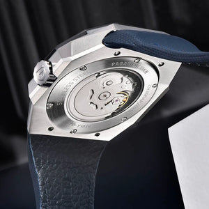 La montre Pagani Design Armored Dark Blue utilise du verre saphir, l'un des matériaux les plus prestigieux du monde de la haute horlogerie, connu pour sa transparence et sa durabilité exceptionnelles.