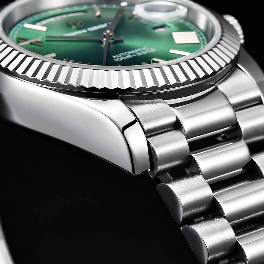 Le mouvement Seiko NH35A est une version améliorée du Seiko NH25, réputé pour sa précision et sa fiabilité exceptionnelles. La Pagani London Green, équipée du mouvement NH35A, bénéficie d'une impressionnante réserve de marche d'environ 45 heures.