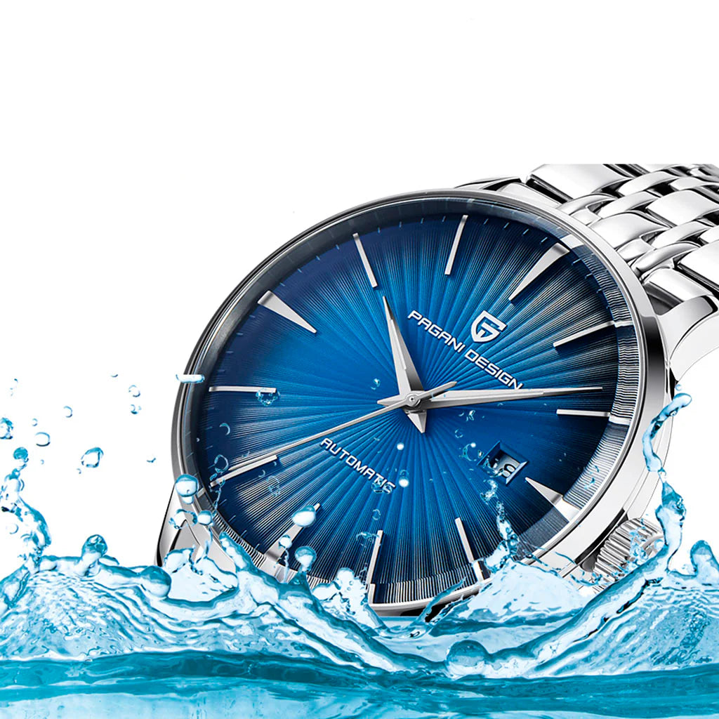 La montre Pagani Design Lugano est étanche jusqu'à 30 mètres, vous offrant confiance et tranquillité d'esprit lors de vos activités nautiques. La couronne de la Pagani Design Lugano est vissée pour garantir une étanchéité parfaite. Consultez le manuel d'utilisation et de garantie pour plus d'informations.
