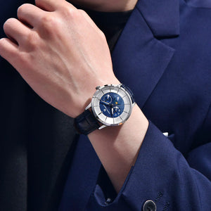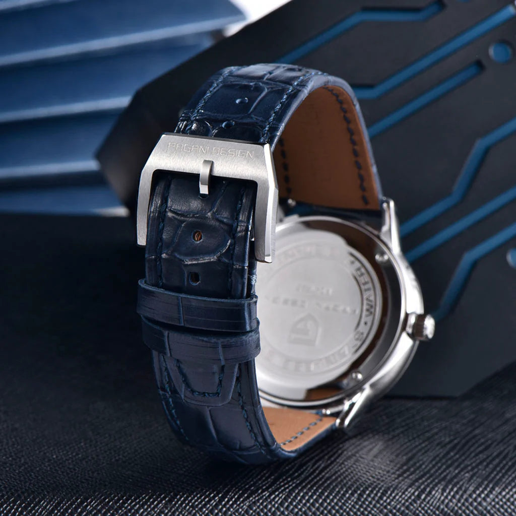 Le bracelet de la Pagani Design Martin Blue Classic Edition est soigneusement confectionné en cuir véritable, alliant la résistance et la légèreté du métal. Il offre un confort inégalé et la sensation unique d'une montre presque imperceptible au poignet.