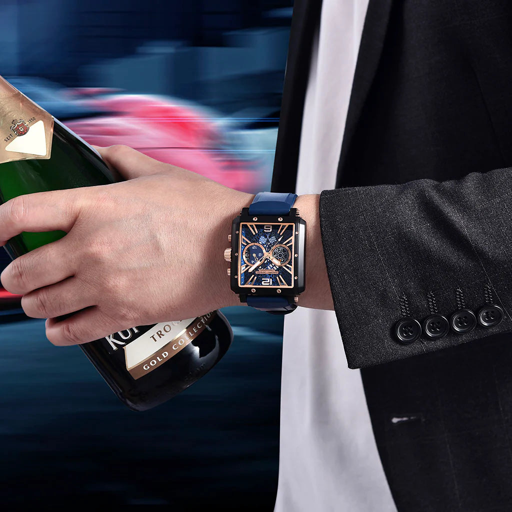 La Pagani Design Monaco Gold Blue est étanche jusqu'à 100 mètres, vous offrant confiance et tranquillité d'esprit lors de vos activités nautiques. La couronne de la Pagani Design Monaco Gold Blue est vissée pour garantir une étanchéité parfaite. Consultez le manuel d'utilisation et de garantie pour plus d'informations.