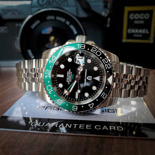 La montre Pagani Design Pantheon Green est étanche jusqu'à 100 mètres, vous offrant confiance et tranquillité d'esprit lors de vos activités aquatiques. Sa couronne vissée assure une étanchéité parfaite. Consultez le manuel d'utilisation et de garantie pour plus d'informations.