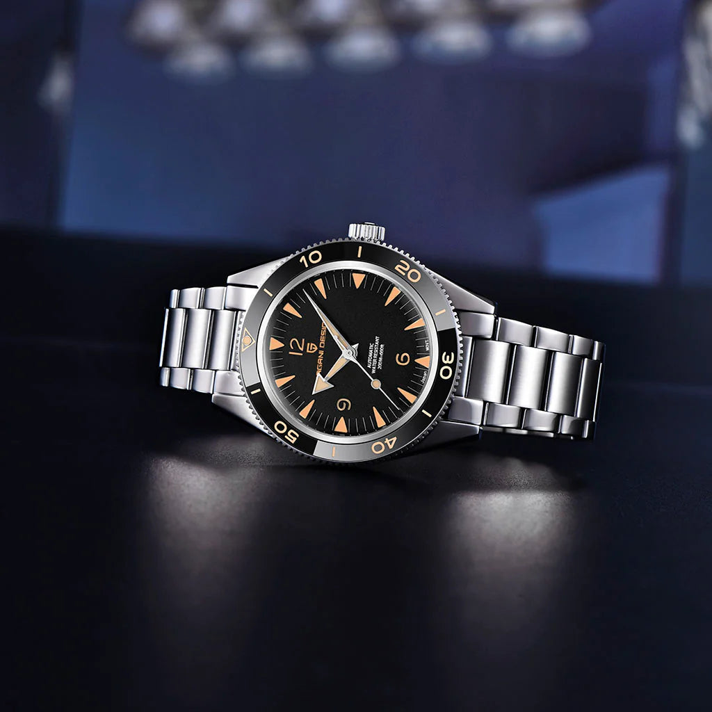 La montre est étanche jusqu'à 100 mètres, vous offrant confiance et tranquillité d'esprit lors de vos activités aquatiques. La couronne de la Pagani Design Davos Black est vissée pour garantir une étanchéité parfaite. Consultez le manuel d'utilisation et de garantie pour plus d'informations.