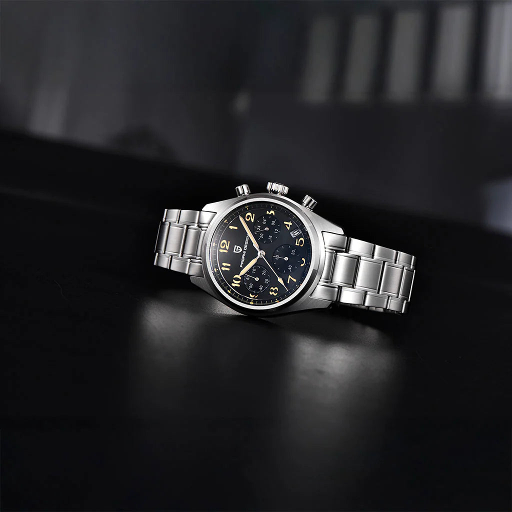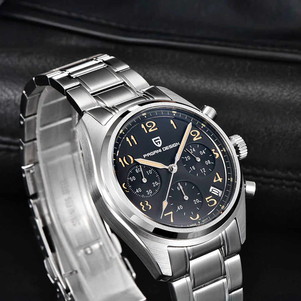 Le mouvement Seiko VK63 est reconnu pour sa précision et sa fiabilité exceptionnelles. La Pagani Design Dresden Black, équipée du mouvement VK63, offre un chronographe fluide et précis.