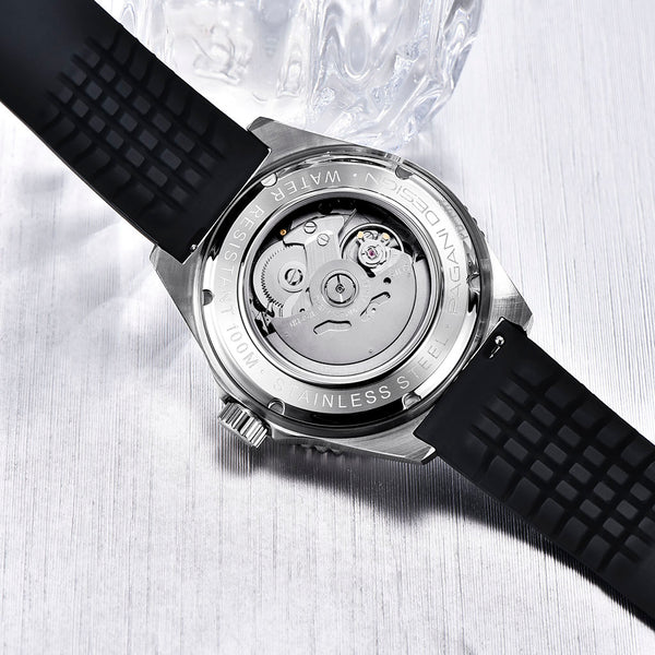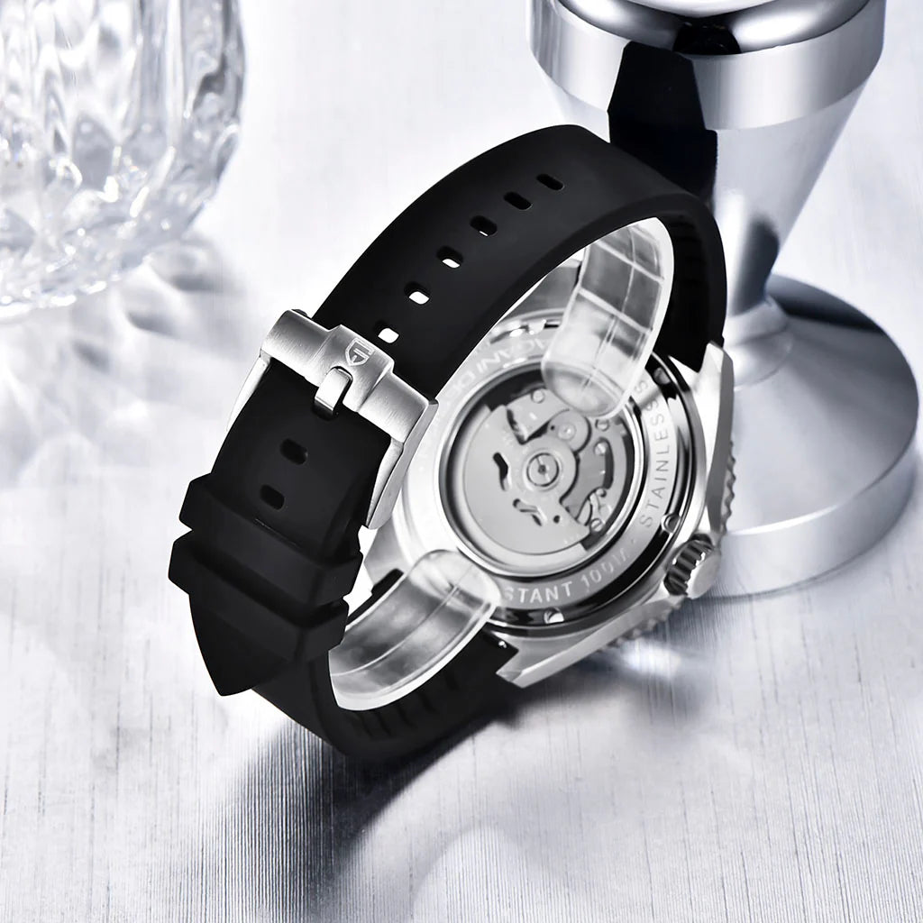 Le bracelet de la Pagani Design Scout Black Sport Edition est soigneusement conçu avec des matériaux haut de gamme, alliant la résistance et la légèreté du caoutchouc. Il offre un confort inégalé et la sensation unique d'une montre presque imperceptible au poignet.