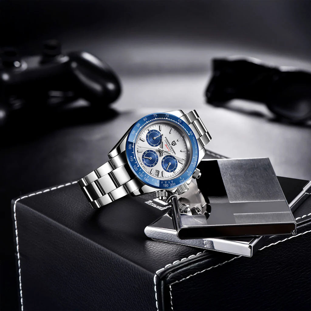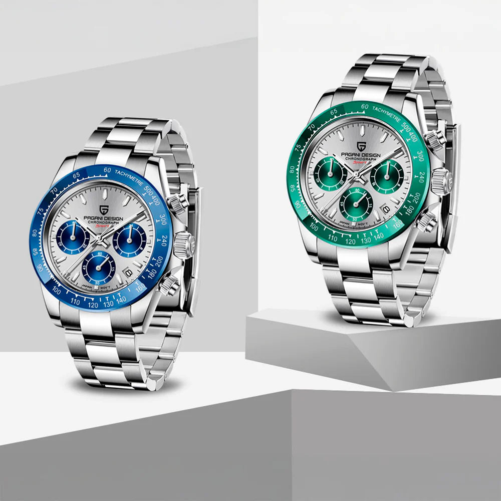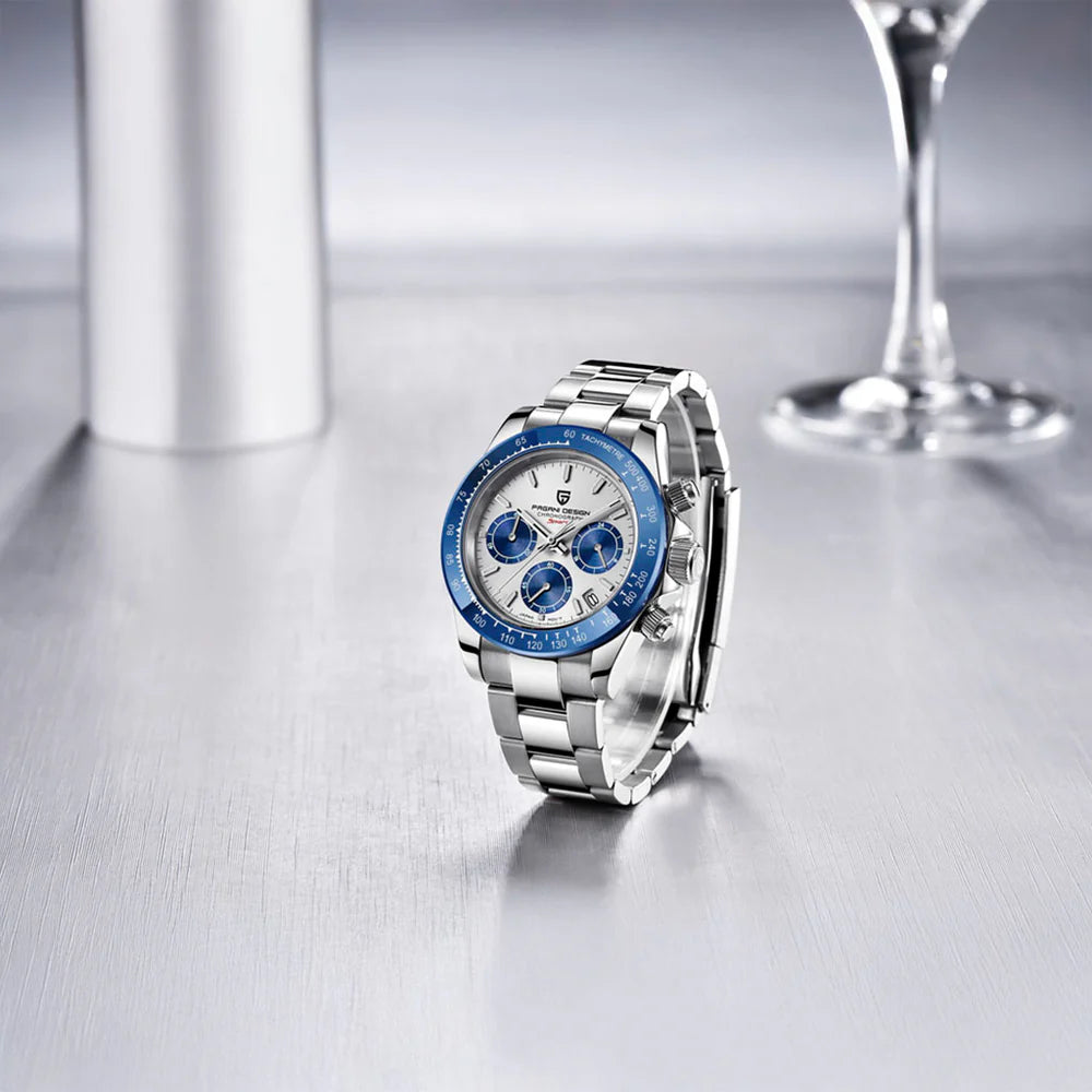 Le mouvement Seiko VK63 est reconnu pour sa précision et sa fiabilité exceptionnelles. La Pagani Design Veraci Silver Blue, équipée du mouvement VK63, offre une précision et une fonctionnalité supérieures.